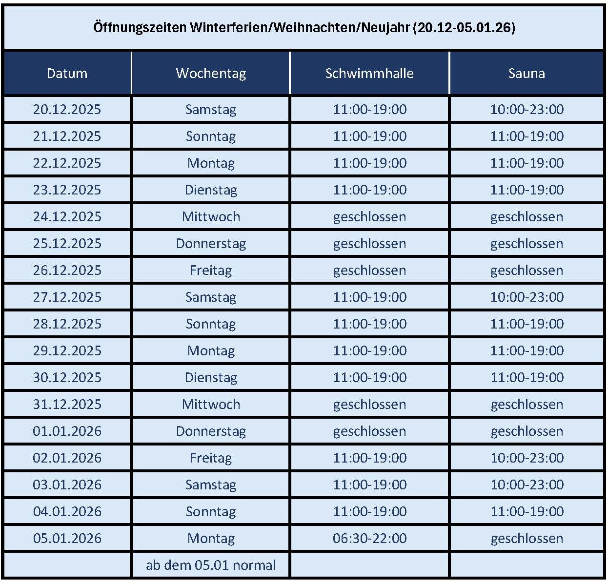 Letzter Einlass Schwimmbad ist 60 Minuten vor dem Ende der Öffnungszeit.
